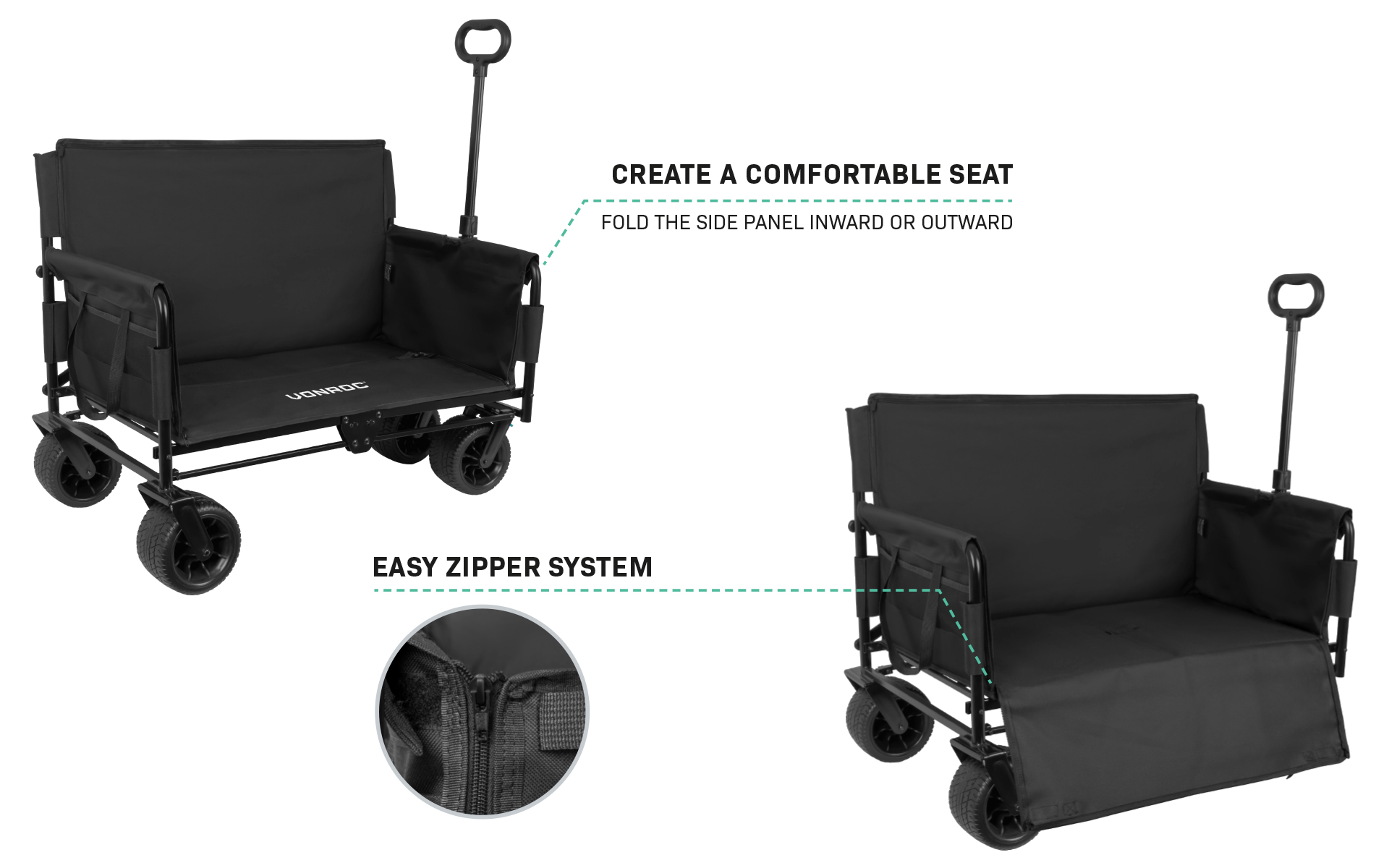„Căruciorul este pliabil?”, vă întrebați poate. Da, toate cărucioarele VONROC din acest blog sunt pliabile și sunt livrate cu o husă de depozitare practică. Pliați, desfășurați, gata — sunteți gata de plecare! După utilizare, se depozitează în portbagajul mașinii într-un pachet compact.